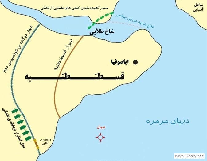 همانطور که گفته شد، سه جهت قسطنطنیه را آب فرا گرفته بود، از سمت جنوب و غرب به دریای مرمره و از شرق و شمال شرقی به تنگهی بوسفور و از شمال به شاخ طلایی (خلیج) که بسیار شدید با لشکری بزرگ از آن محافظت میشد و از ورود هر کشتی به درون آن جلوگیری میشد.
